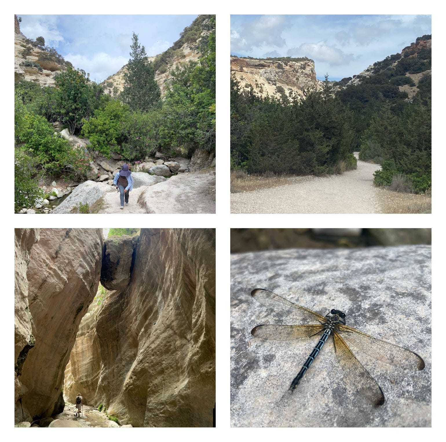 It’s a 2 km (1.5 mile) drive along a rutted dirt road to get to the parking lot. Some tourists choose to park their cars at the beginning of the dirt road and walk the 2 km road to the start of the trail. The trail starts as a path through a wide valley before the walls close in and the narrow gorge starts. There are multiple signs to beware of falling rocks, though we did not see or hear any rockfalls. There are several routes one can choose, but the shortest, which we chose, is a there-and-back hike through the gorge which took us about an hour. It does offer some stunning views of high, sheer canyon walls as one is alks along the river bed.